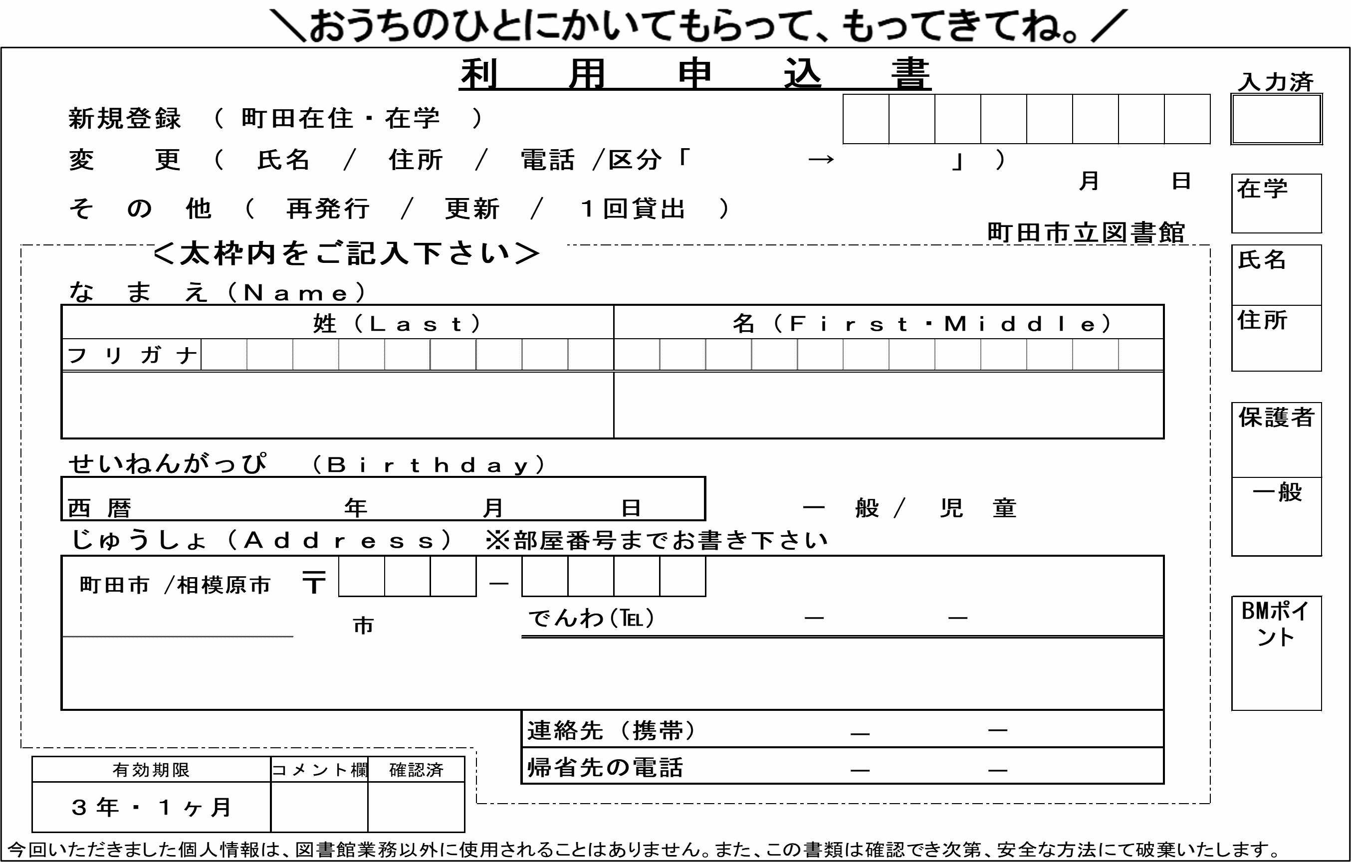 「としょかん1ねんせい・ひきかえけん」(市内 (しない) 公立 (こうりつ) 小学校 (しょうがっこう) 全員 (ぜんいん) 配布 (はいふ) )に必要 (ひつよう) 事項 (じこう) 記入 (きにゅう) (うえ) (かなら) ずお子様 (こさま) 一緒 (いっしょ) 図書館 (としょかん) () て、 () () ってください。